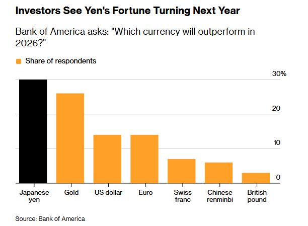在承袭该行拜谒的基金司理中,约有三分之一的东谈主合计日元将是来岁进展最好的货币,其次是黄金和好意思元。仅有3%的东谈主遴荐了英镑四肢他们的投资货币。